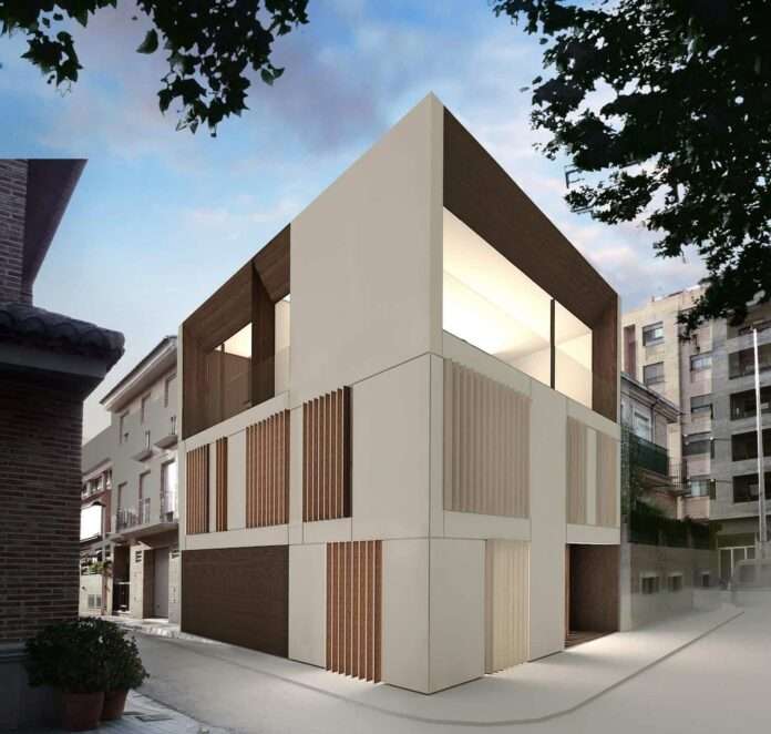 El uso de madera en el diseño de la fachada marca la ubicación tanto de la cocina como del salón además de formar parte de la gran terraza que ocupa la parte superior de la vivienda. El resto de entradas de luz se cierran utilizando un sistema de lamas motorizadas de color blanco, que una vez que se abren, muestran en su interior la madera que forman parte de la estructura.
