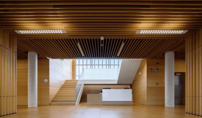 Frente a una piel exterior de hormigón visto que, en ocasiones, también queda al descubierto en el interior del edificio, el bambú de Grupo GUBIA aporta a estas oficinas un ambiente acogedor de trabajo en el interior. Puertas enrasadas a revestimientos, lamas de bambú a modo de celosías que revisten techos, petos, barandillas… o piezas del mismo material que cubren las escaleras de comunicación entre las distintas plantas, son una muestra del cuidado nivel de detalle de todo el proyecto.