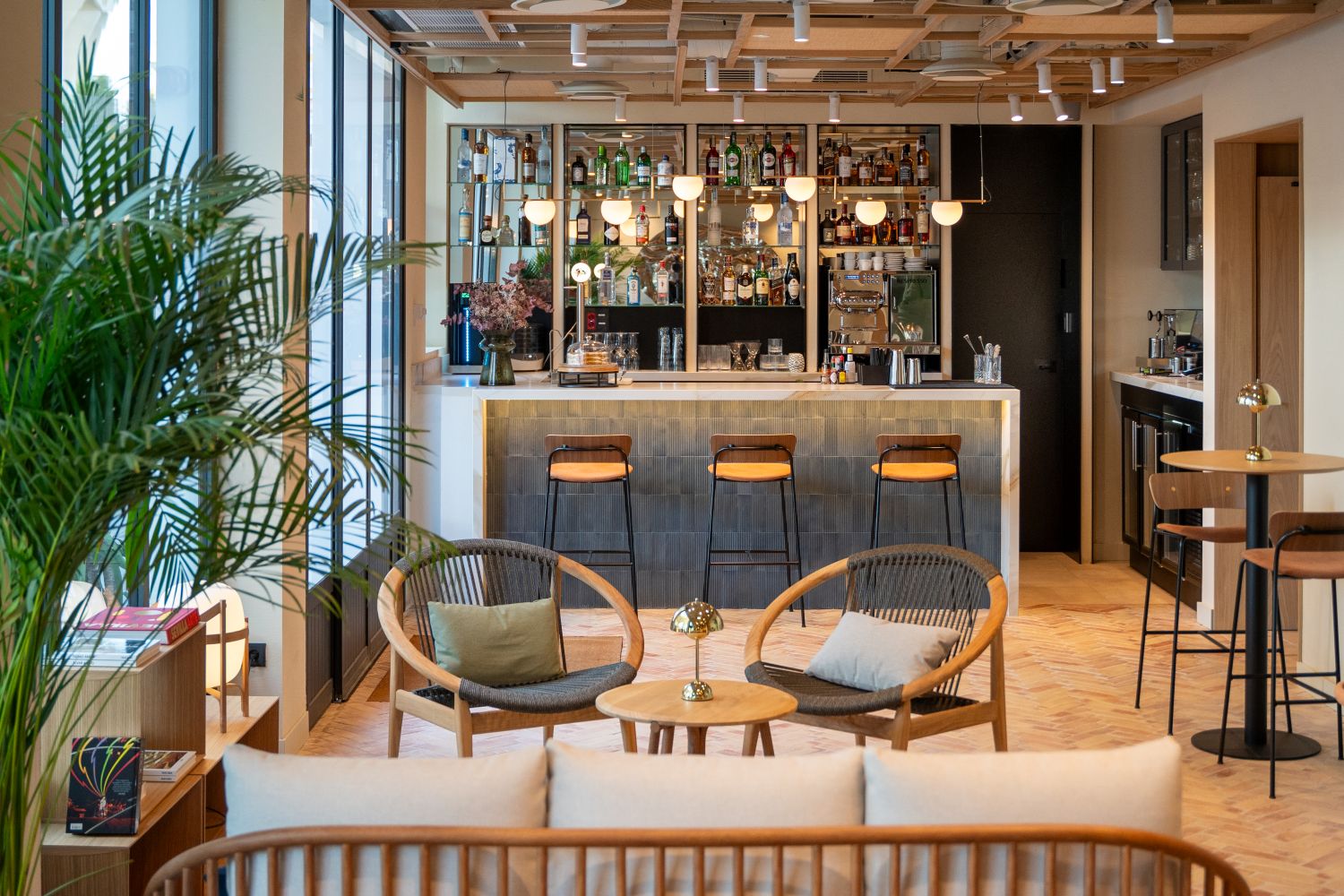 En las plantas superiores, las 49 habitaciones han sido diseñadas como refugios de serenidad. La materialidad noble y el mobiliario artesanal construyen una atmósfera de descanso, matizada por la presencia de vegetación que introduce frescura en la estancia. El programa del hotel se completa en la primera planta con un espacio de coworking, una respuesta funcional y contemporánea a las nuevas demandas del viajero, integrada sin romper la continuidad estética del proyecto.