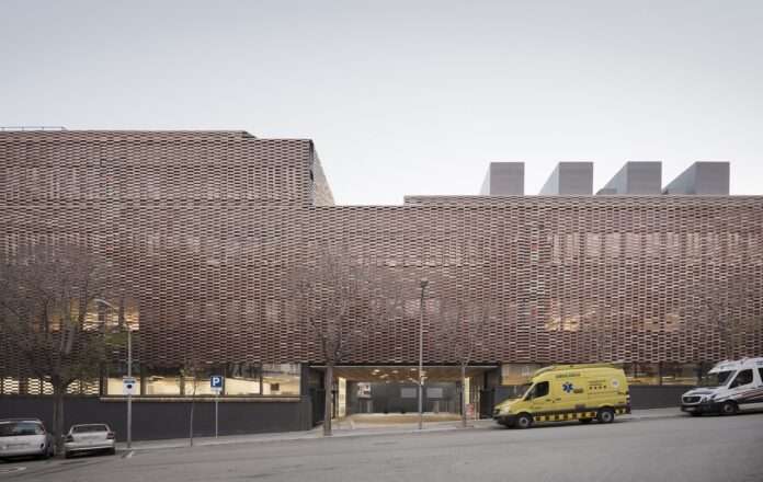La fachada es una piel cerámica y tecnológica a modo de celosía, con la misma gama cromática que los pabellones históricos del hospital modernista, que cambia de apariencia constantemente a lo largo de todo el día, tanto desde el exterior como en el interior del edificio.