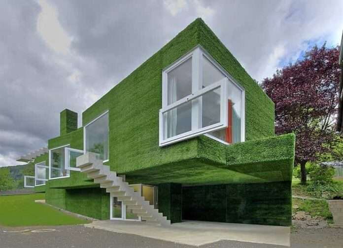 La primera de las fachadas que os mostramos, corresponde a una casa de estilo posmoderno. Llama mucho la atención por el uso de césped en su fachada, pero no penséis que es natural, sino que se ha utilizado su versión sintética para darle ese toque verdoso a la vivienda. Además de eso, también destaca la escalera o el uso de una ventana que sobresale de las dimensiones de la pared.