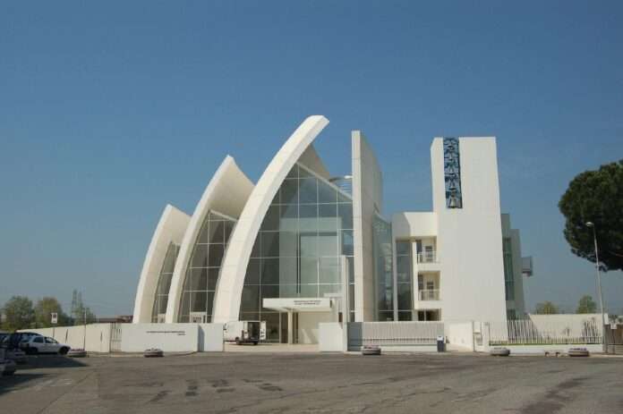Esta iglesia fue construida en Roma en el año 1996, con un diseño muy novedoso que consiste en varias paredes curvas que se asemejan a las velas de los barcos antiguos. Estas paredes están fabricadas con un cemento especial, que contiene dióxido de titanio, que ayuda a controlar la contaminación del aire.