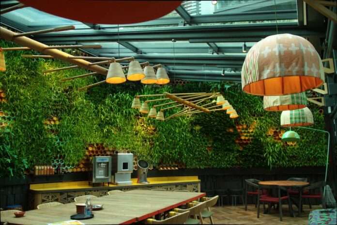 Su diseño se llevó a cabo en la sala principal de ese restaurante, la cual está cubierta con un techo de cristal que proporciona la iluminación necesaria para que las plantas puedan vivir.