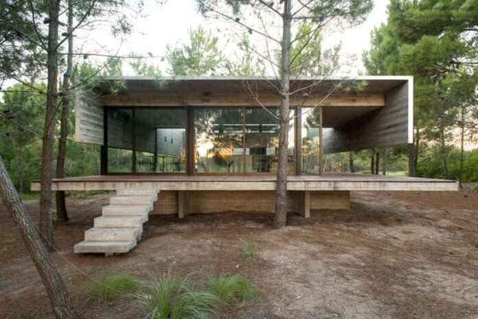 Los encargado del diseño de esta casa de vacaciones ha sido el arquitecto Luciano Kruk. Como se puede observar, fue levantada en una zona boscosa próxima a la ciudad de Buenos Aires. Cuenta con dos zonas bien definidas que se encargan de separar las áreas sociales de las áreas privadas. Lo irregular del terreno hizo que se tuviera que construir una base elevada sobre la que se construyó la vivienda.