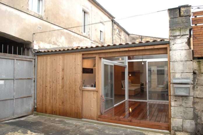 Lo que nadie se espera, es que una vez que la puerta de metal se abre, da paso a una fachada moderna de madera formada por varios paneles.